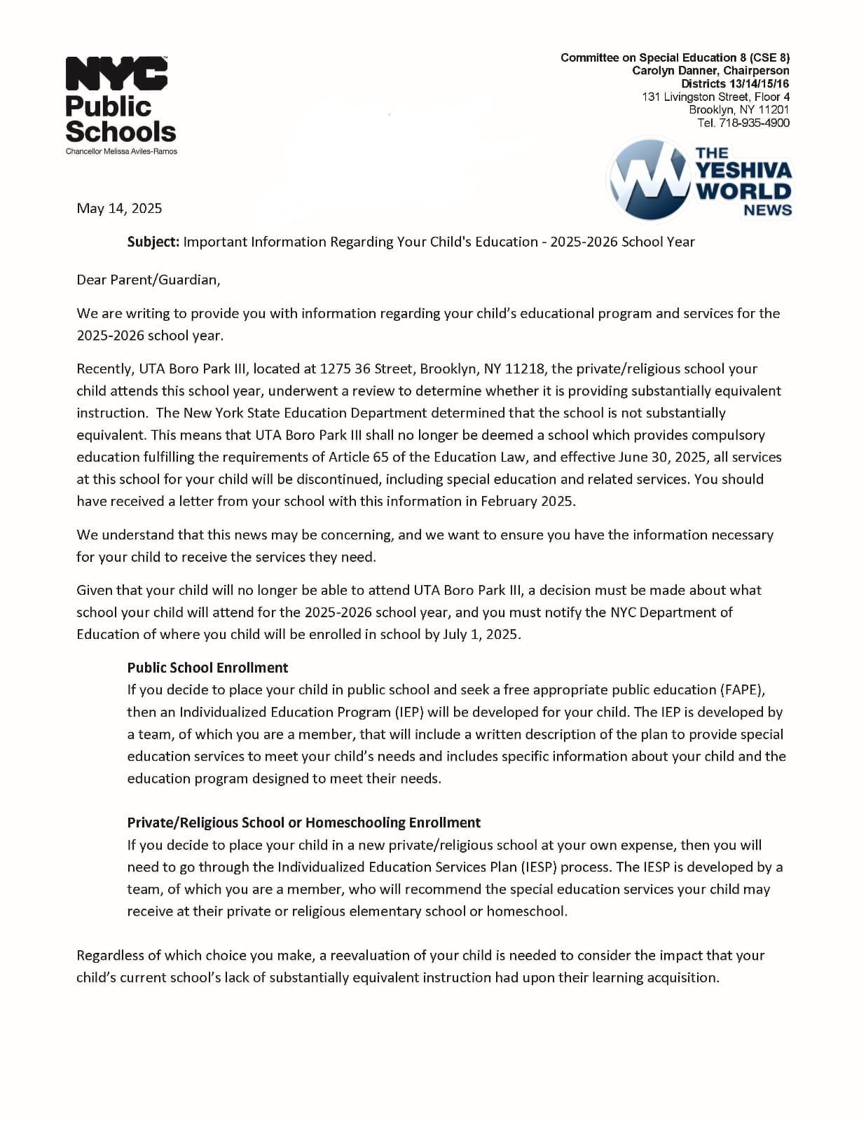 In particular, there is no basis for the letters to inaccurately tell parents “Given that your child will no longer be able to attend (their school) a decision must be made about which school they will attend for the 2025-26 school year.” Given SED’s concession at the Court of Appeals today, children can absolutely continue to attend their nonpublic school.