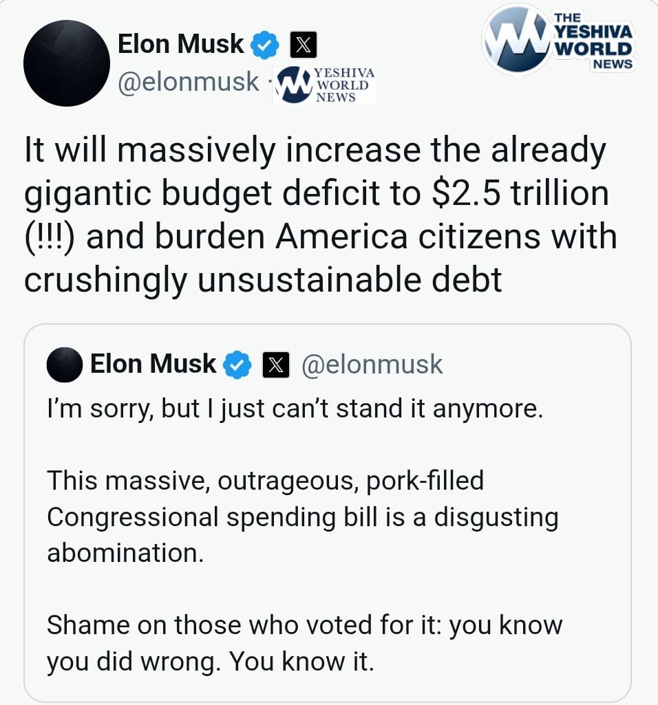 “Shame on those who voted for it: you know you did wrong. You know it,” wrote Musk, who until last week led the Trump administration’s DOGE effort to cut government spending and waste.