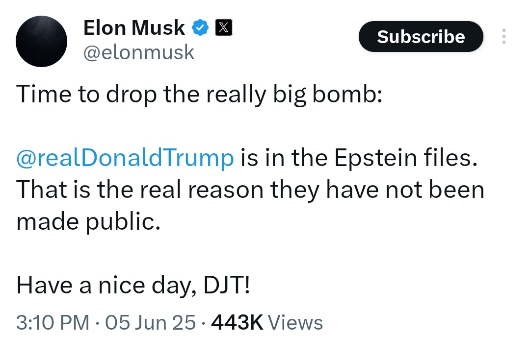 - Elon Musk alleged that President Trump is “in the Epstein files.”