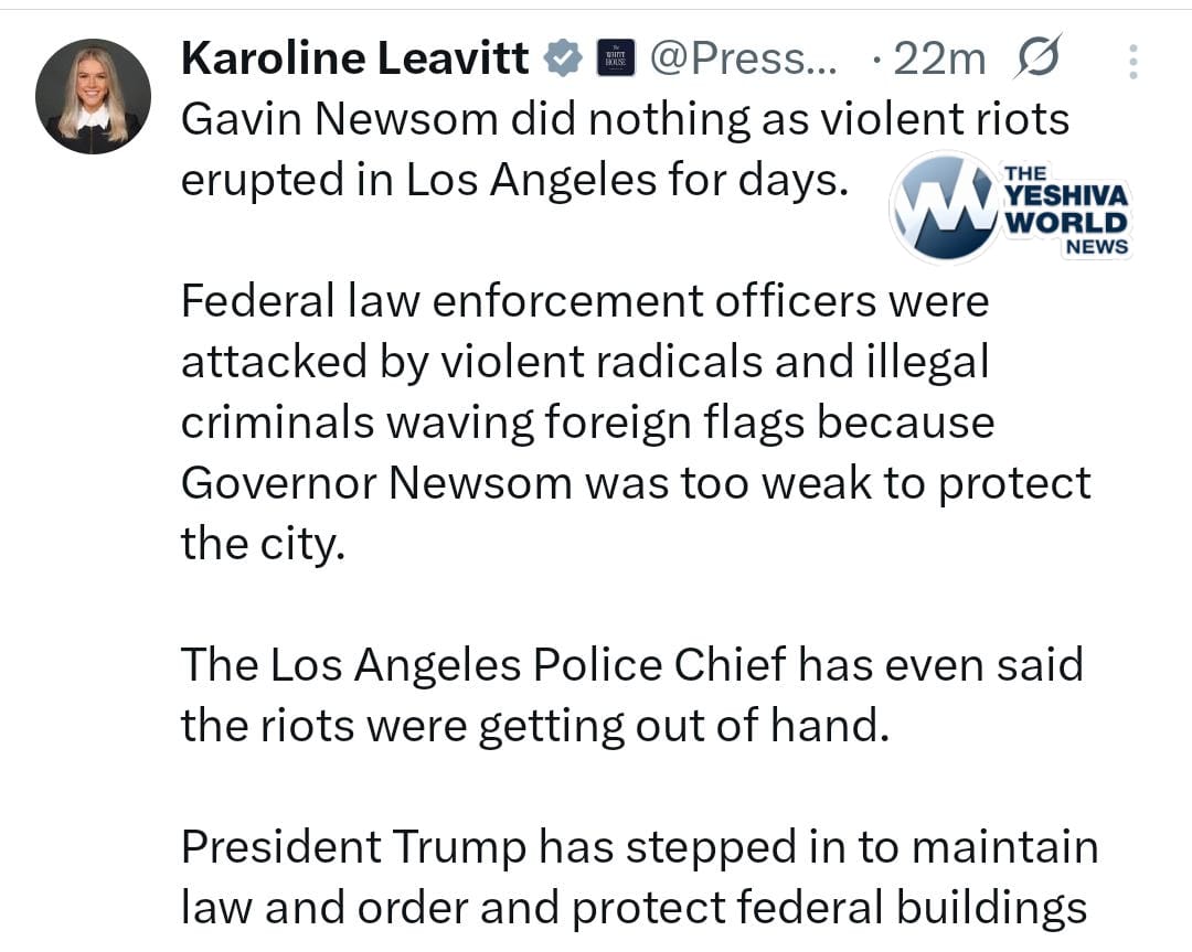 “Federal law enforcement officers were attacked by violent radicals and illegal criminals waving foreign flags because Governor Newsom was too weak to protect the city,” Leavitt said. “The Los Angeles Police Chief has even said the riots were getting out of hand.”