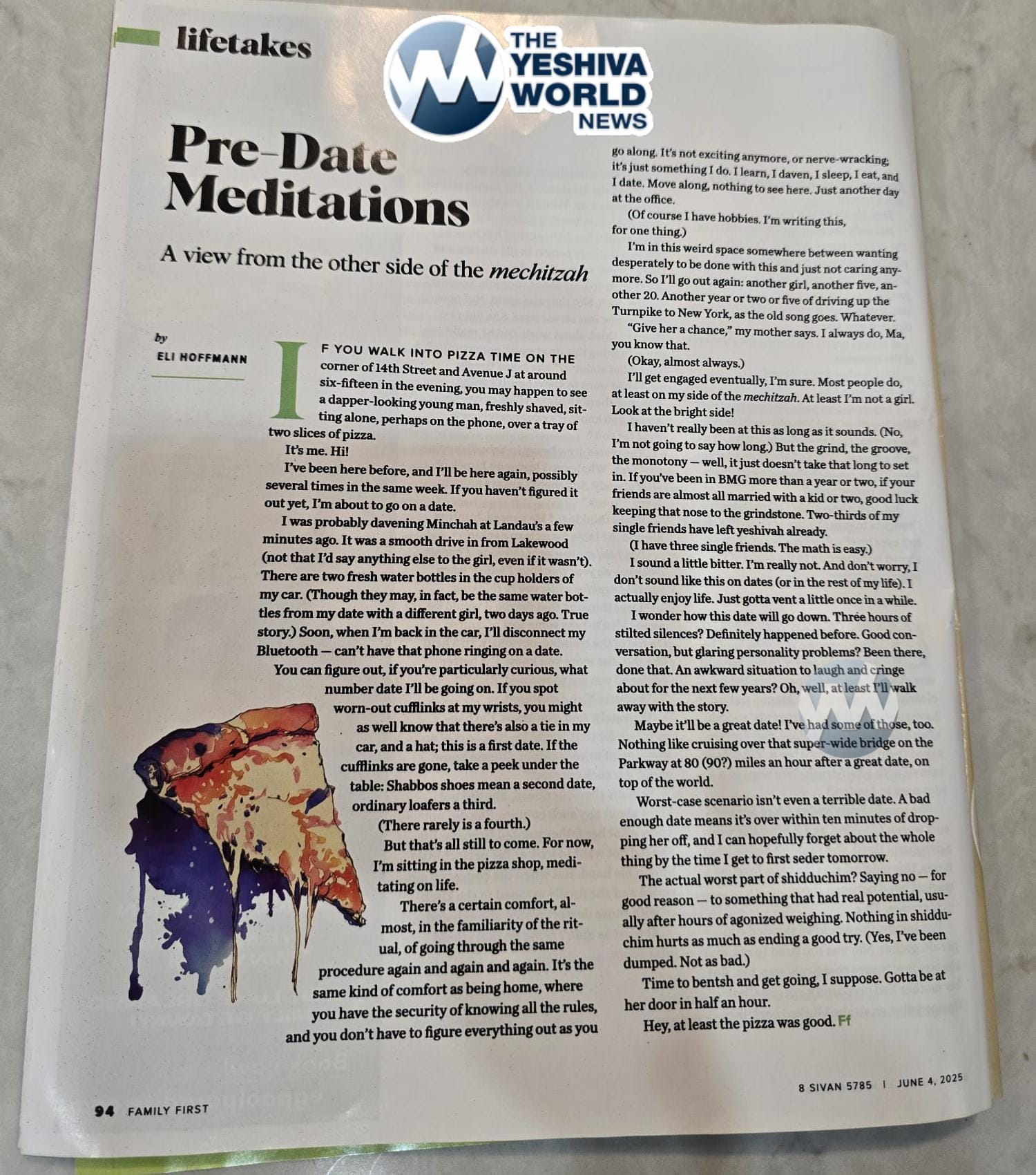 I am writing to express my profound outrage and disgust regarding an article titled “Pre-Date Meditations” by Eli Hoffmann, published in the Family First section of Mishpacha magazine, dated June 4, 2025. The piece, appearing in a publication aimed at women, is an insensitive and narcissistic rant that shamelessly trivializes the experiences of countless girls and women navigating the dating world, particularly within the context of shidduchim.