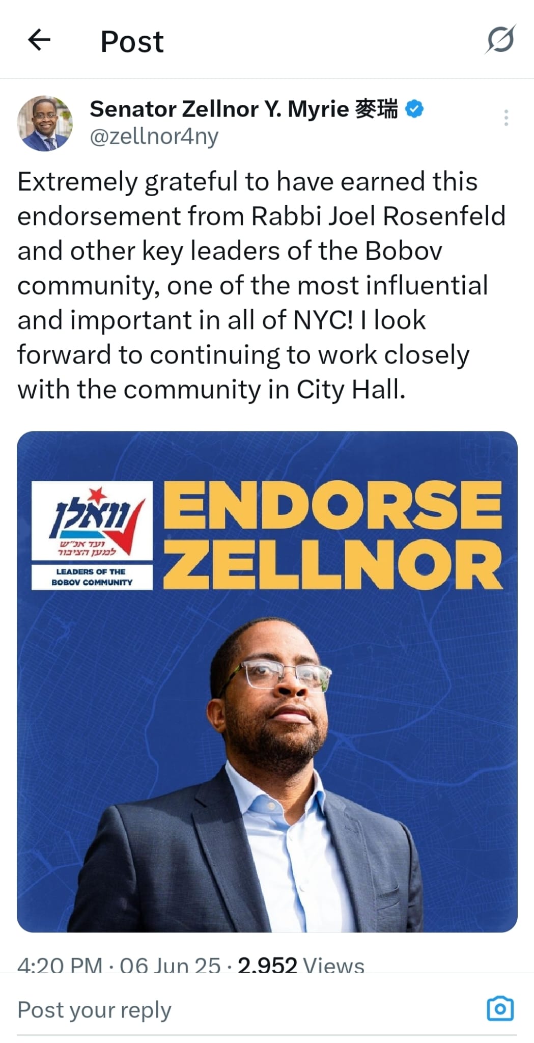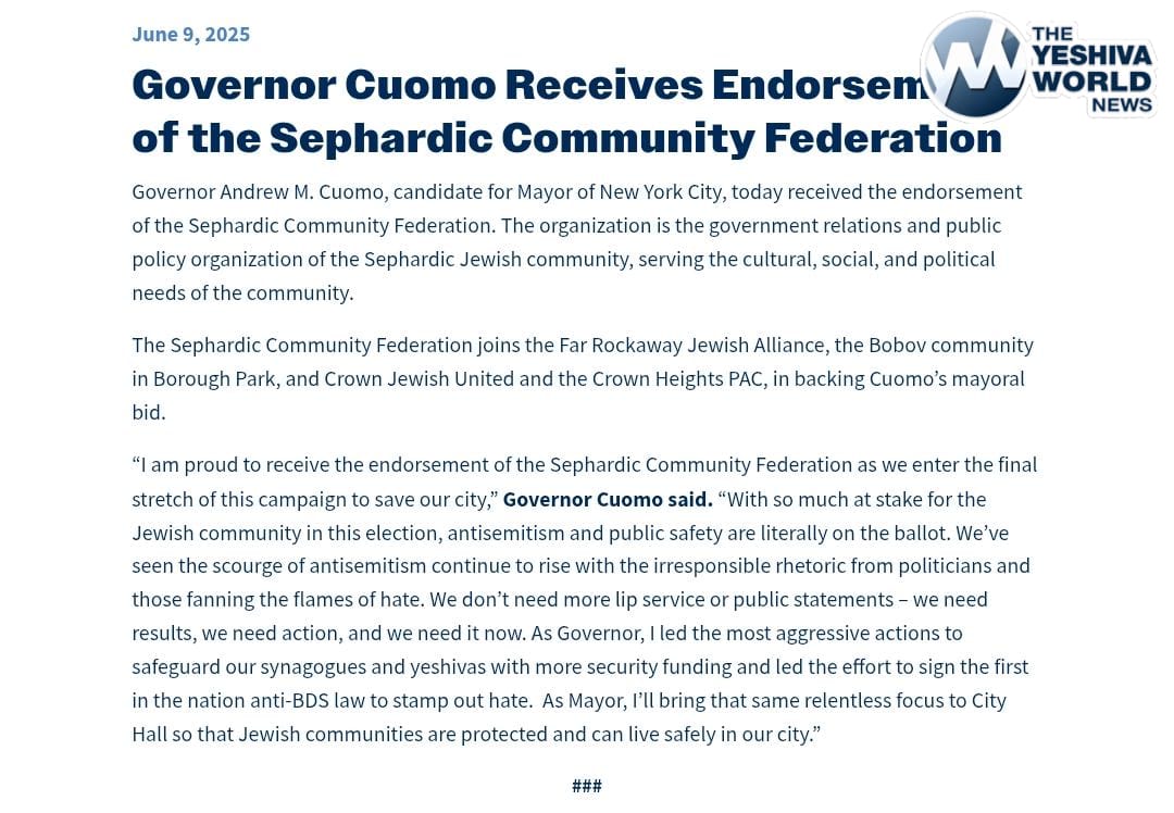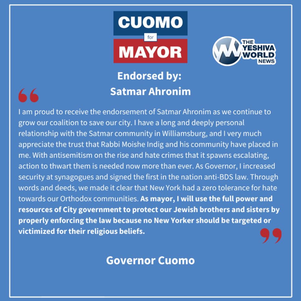 - Bobov: Cuomo sent out a press release claiming an endorsement. BUT Zellnor Myrie claims he got an endorsement from Rabbi Joel Rosenfeld “and other key leaders of Bobov”. So who really endorsed who? YWN has no clue.