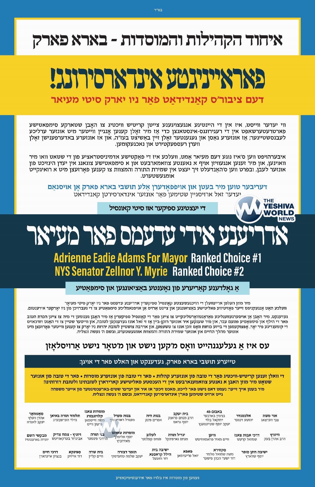 - Williamsburg Mosdos: A colorful flyer below endorses three candidates and is signed (printed names) by well-known Askanim in Williamsburg. But no names of any Mosdos are attached.