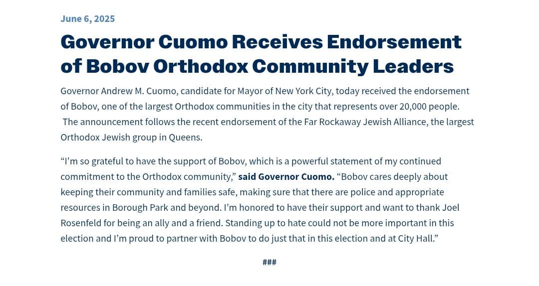 Bobov endorsed Cuomo. They endorsed Zellnor in third place.