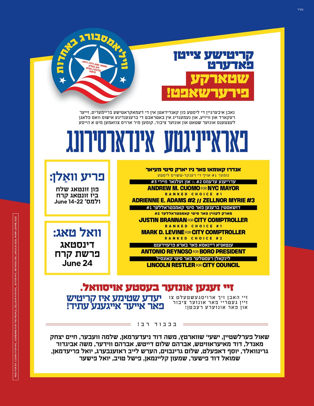 - Satmar Zalonim: #1- Cuomo. #2- Adrienne Adams #3- Zellnor Myrie.