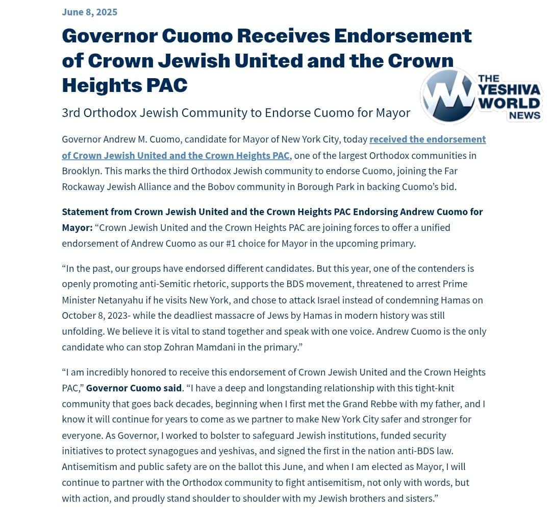- Satmar Aronim: Cuomo, though Mamdani claims Rabbi Moshe Indig met with him and may add him to their slate. Indig reportedly called Mamdani “a very nice guy, very humble… not an antisemite” and said he’d work with the entire city. However, Indig publicly told Mayor Eric Adams this week, “In November, you’ll see… with God’s help, we will come out and show our great support for our great mayor and brother, Eric Adams.” YWN notes the Aronim endorsed Andrew Yang in 2021 but switched last-minute, so shifts are possible.