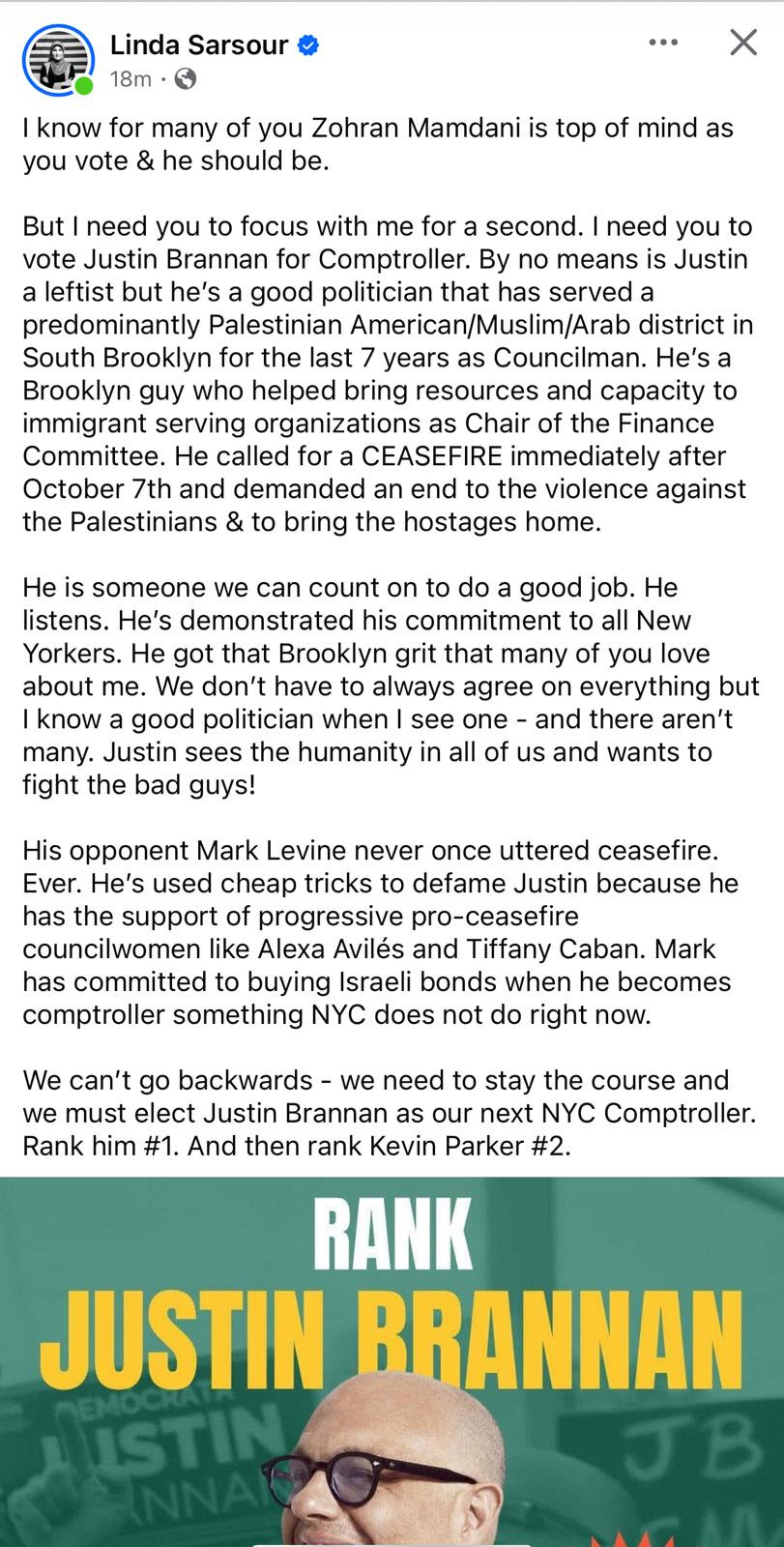 Take, for example, Linda Sarsour, a longtime anti-Israel activist who recently urged her followers to vote for Brannan, praising his work for “Palestinian American/Muslim/Arab” communities. In her endorsement, she attacks Brannan’s opponent, Mark Levine, solely for standing with Israel. She criticizes Levine for refusing to call for a ceasefire immediately after the October 7th Hamas massacre and for committing to buy Israeli bonds as Comptroller.