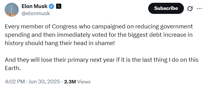 In a follow-up post, Musk escalated his attack, declaring that every member of Congress who votes for the bill should “hang their head in shame” and vowing political revenge.