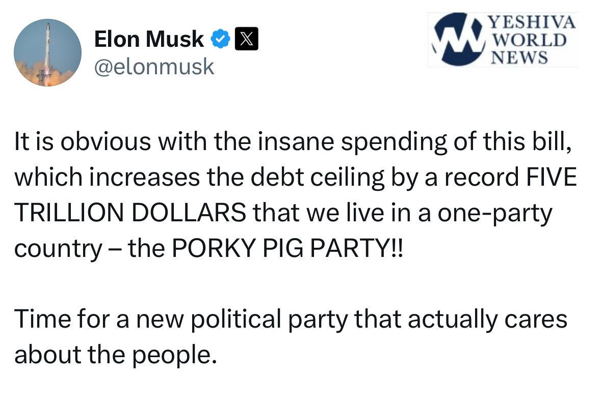“It is obvious with the insane spending of this bill, which increases the debt ceiling by a record FIVE TRILLION DOLLARS, that we live in a one-party country – the PORKY PIG PARTY!!” Musk wrote on X, the social media platform he owns.