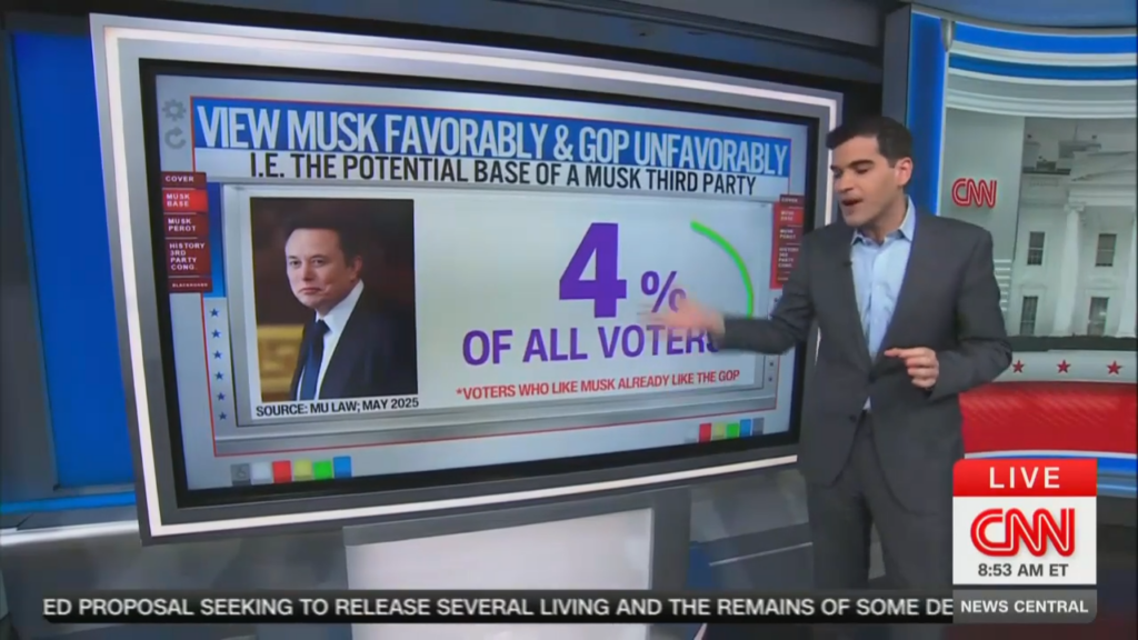 Enten pointed to the glaring overlap between Musk’s fan base and the Republican Party, arguing that Musk is attempting to build a movement out of voters who already have a political home. “We’re talking about just four percent of voters who like Musk but don’t like the GOP,” he said. “That’s not a base—it’s a statistical rounding error.”