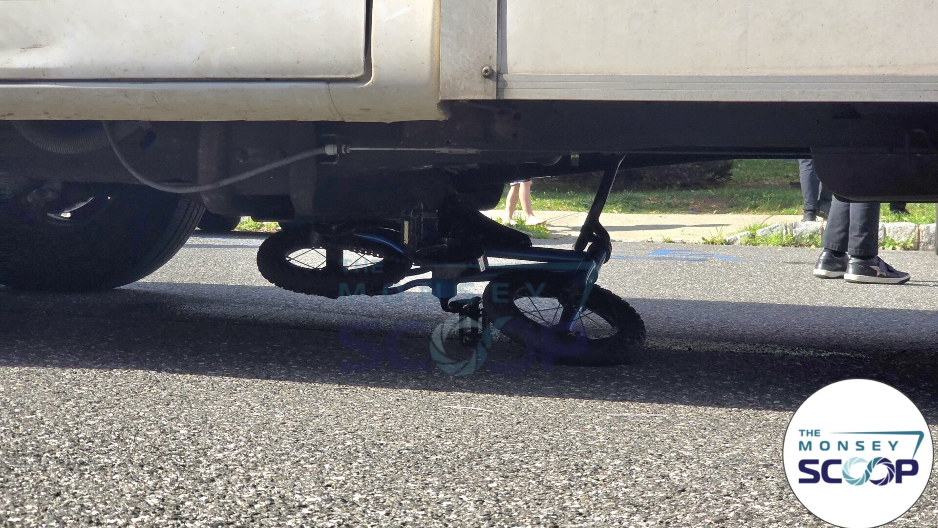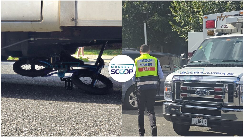A terrifying incident unfolded Wednesday afternoon in Monsey, as a young child riding his bike was struck by a truck — leaving his bike partially crushed beneath the vehicle.