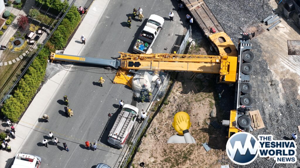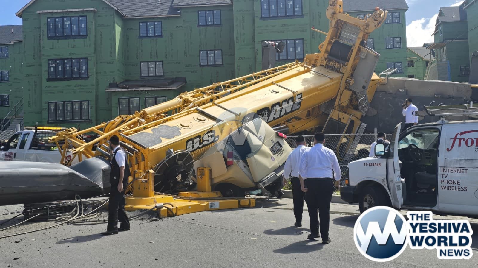 A major incident unfolded Tuesday morning in Kiryas Joel, as a construction crane collapsed at the intersection of Acres Road and Bakertown Road, landing directly on top of a 15-passenger van. In what can only be described as a miracle, no injuries were reported despite the severity of the collapse.
