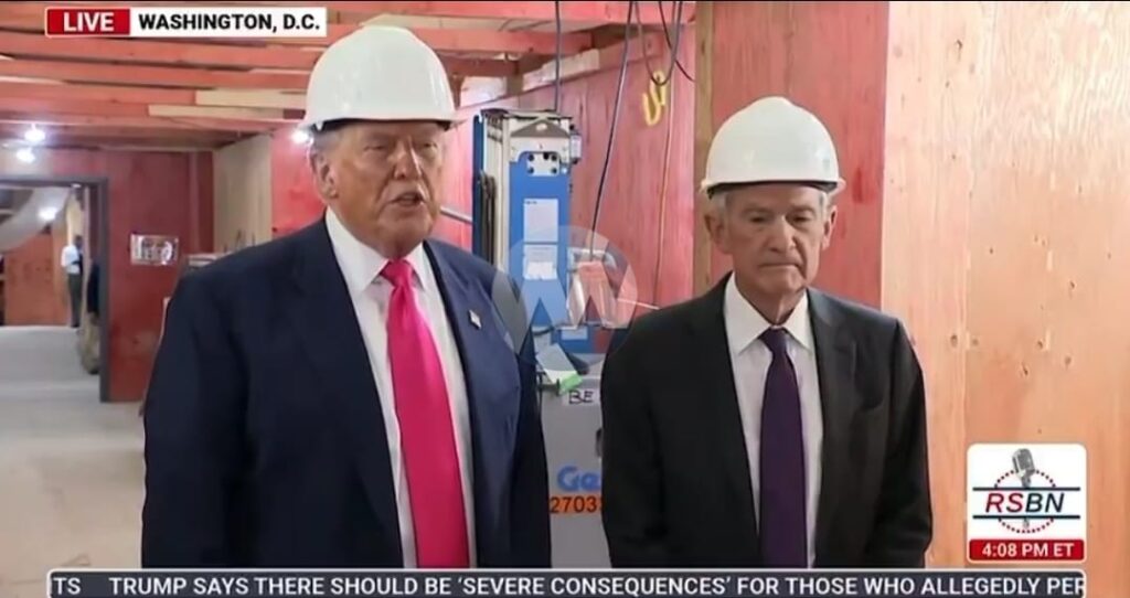 Wearing hard hats and grim faces, standing in the middle of the construction project, Trump and Powell addressed the cameras. Trump charged that the renovation would cost $3.1 billion, much higher than the Fed’s $2.5 billion figure. Powell, standing next to him, shook his head.