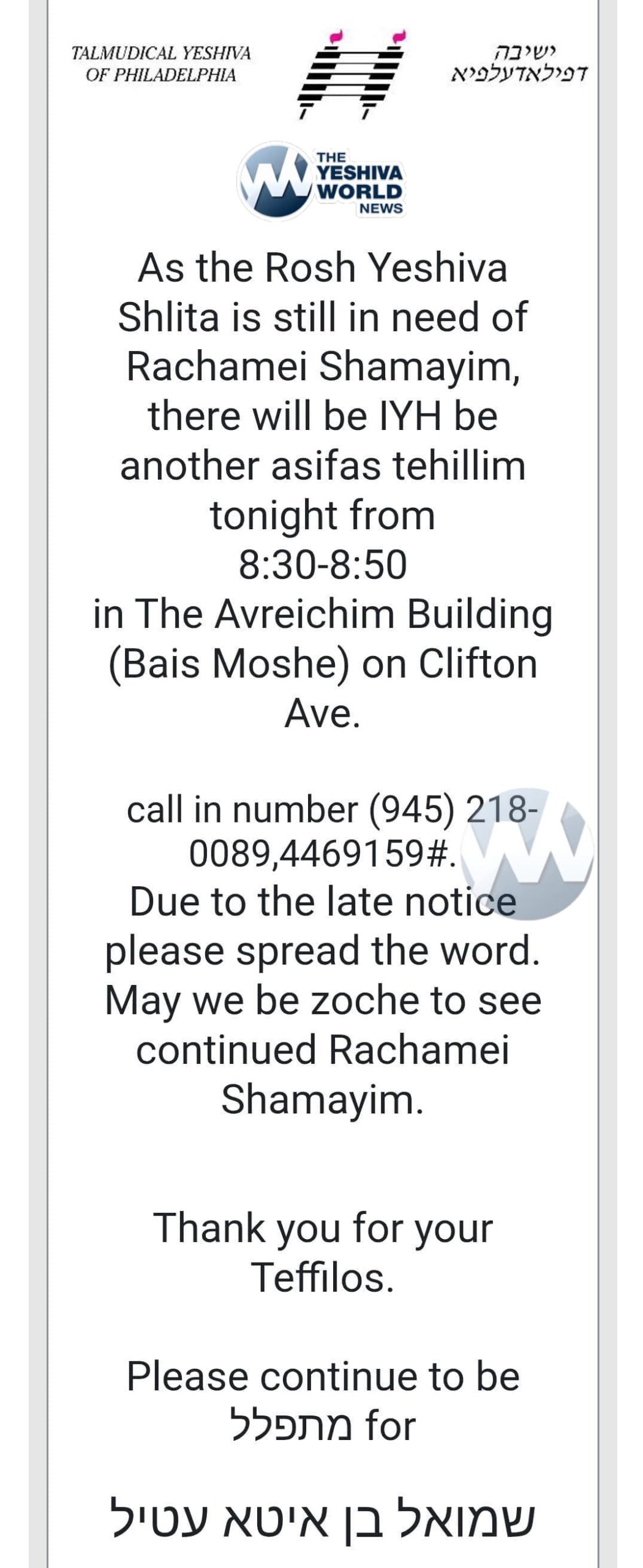 An Asifas Tehillim will be held tonight in Beth Medrash Govoha (BMG) in Lakewood as part of a broader effort across communities to be mechazek tefillah and zechuyos for Rav Shmuel’s recovery.