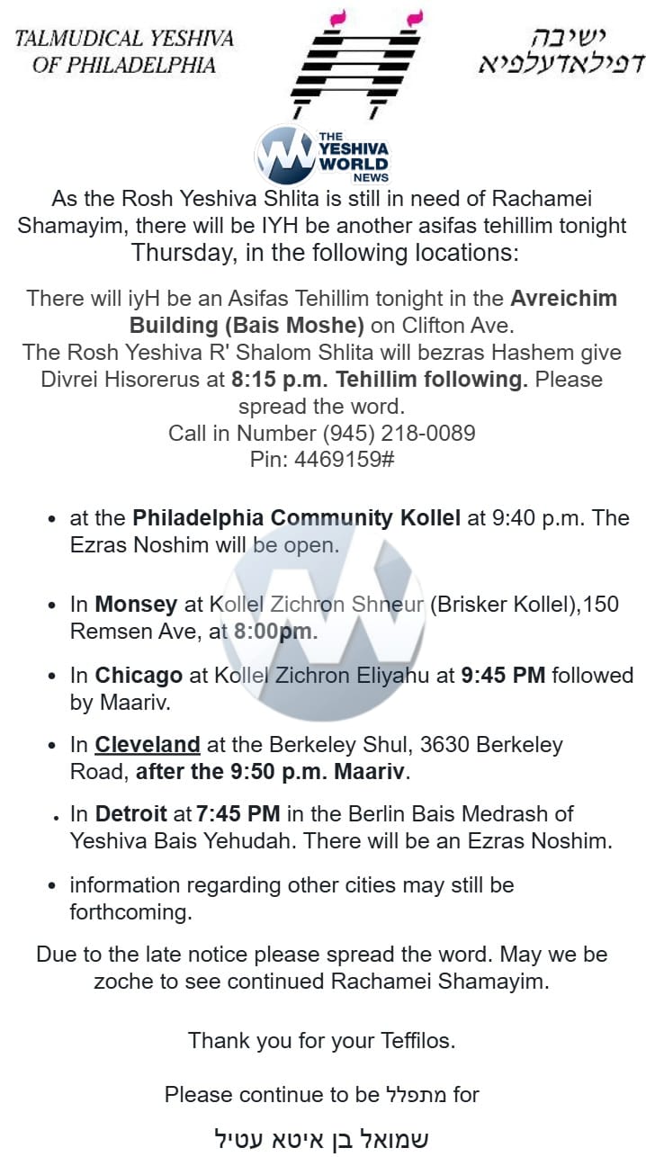 The Talmudical Yeshiva of Philadelphia has announced that, due to the ongoing need for Rachamei Shamayim for the Rosh Yeshiva, Hagaon HaRav Shmuel Kamenetsky, an additional Asifas Tehillim will take place tonight, across multiple locations.