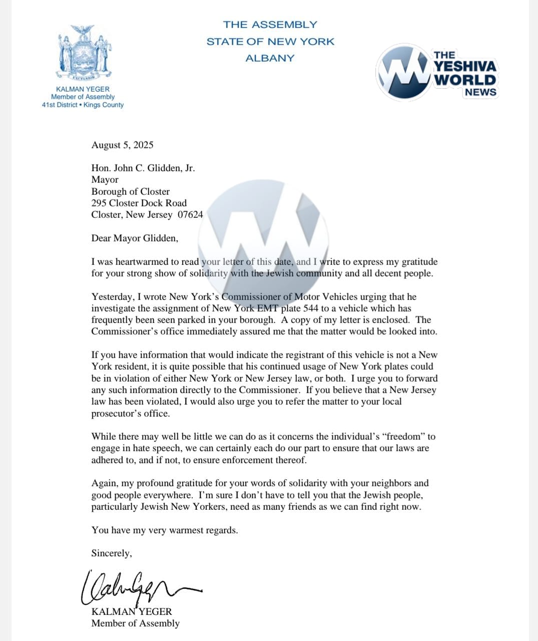 On Tuesday night, New York State Assemblyman Kalman Yeger (D-Brooklyn), who had already contacted New York’s DMV demanding a review of the EMT license plate registration, responded to the Closter letter with a message of gratitude.