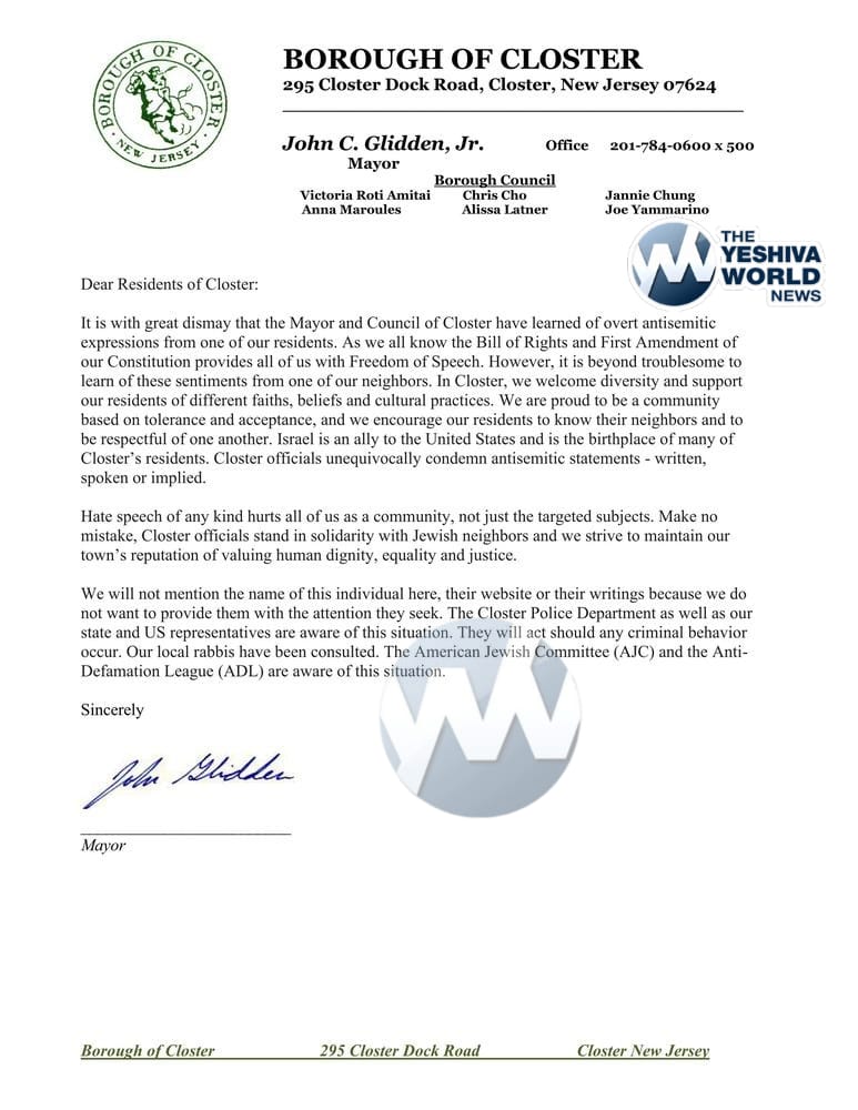 The letter noted that while the First Amendment protects freedom of speech, hate speech—especially involving antisemitic imagery—violates the spirit of Closter’s values. “Make no mistake,” the borough wrote, “Closter officials stand in solidarity with Jewish neighbors and we strive to maintain our town’s reputation of valuing human dignity, equality and justice.”