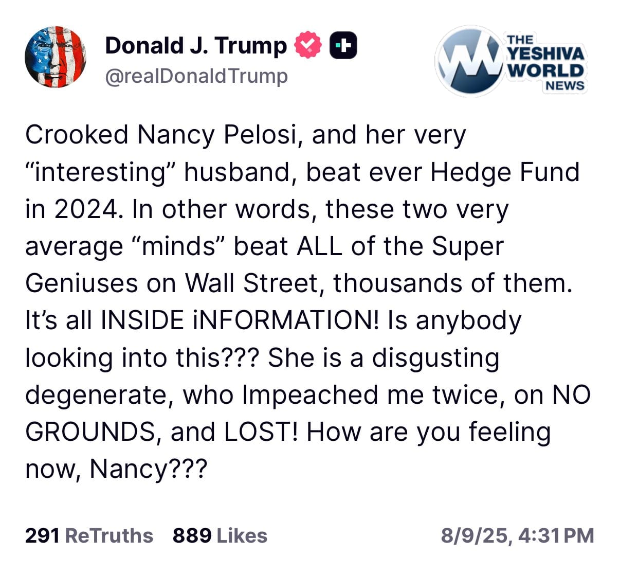 In a Truth Social post, Trump mocked the Pelosis as “two very average ‘minds’” who somehow “beat ALL of the Super Geniuses on Wall Street” in 2024. “It’s all INSIDE INFORMATION! Is anybody looking into this???” he wrote, before branding Pelosi a “disgusting degenerate” who “Impeached me twice, on NO GROUNDS, and LOST!”