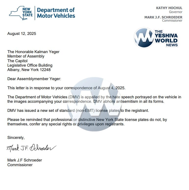 In a letter sent Tuesday to Yeger, DMV Commissioner Mark J.F. Schroeder said the agency was “appalled by the hate speech portrayed on the vehicle” and “abhors antisemitism in all its forms.” Schroeder confirmed that the DMV had issued the registrant a new set of standard, non-EMT plates.