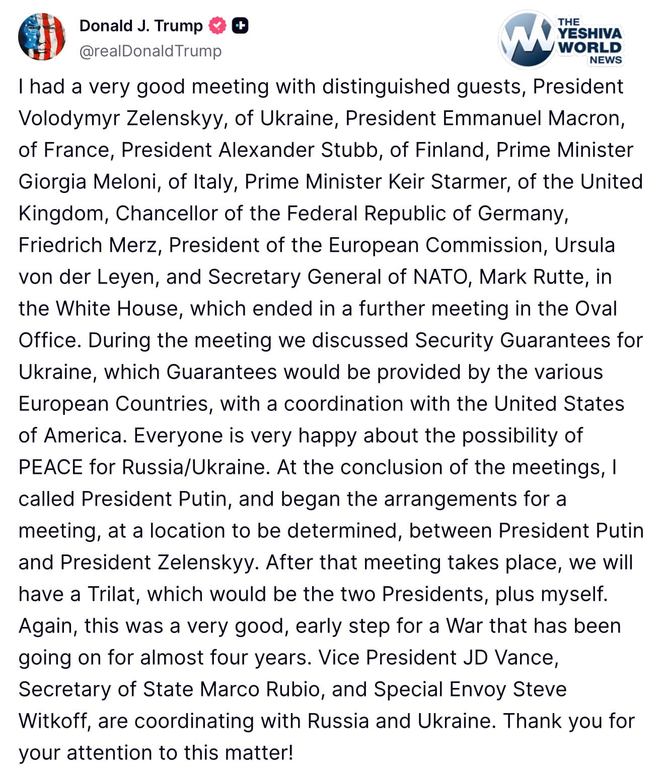 The other European leaders in attendance were: European Commission President Ursula von der Leyen, French President Emmanuel Macron, British Prime Minister Keir Starmer, Italian Premier Giorgia Meloni, Finnish President Alexander Stubb and NATO Secretary-General Mark Rutte.