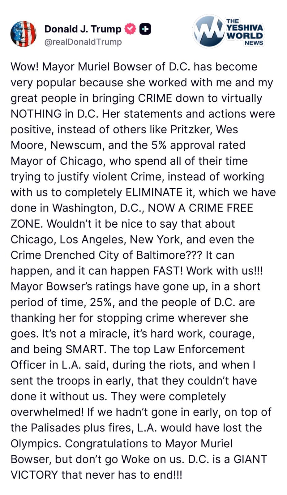 “Wow! Mayor Muriel Bowser of D.C. has become very popular because she worked with me and my great people in bringing CRIME down to virtually NOTHING in D.C.,” Trump wrote in a Truth Social post. He contrasted Bowser with Illinois Gov. JB Pritzker, Maryland Gov. Wes Moore, and California Gov. Gavin Newsom — whom he mockingly labeled “Newscum” — accusing them of “spending all their time justifying violent crime” instead of cooperating with federal enforcement.