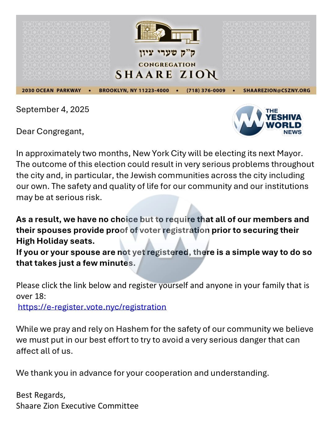 Shaare Zion, the largest Sephardi shul in Brooklyn, has announced that proof of voter registration will now be required for members and their spouses to reserve seats for Yomim Noraim — a groundbreaking policy believed to be the first of its kind in the frum community.