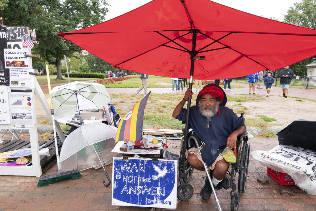 The vigil was started in 1981 by activist William Thomas to promote nuclear disarmament and an end to global conflicts. It is believed to be the longest continuous anti-war protest in U.S. history. When Thomas died in 2009, other protesters like Melaku-Bello manned the tiny tent and the banner, which read “Live by the bomb, die by the bomb,” around the clock to avoid it being dismantled by authorities.