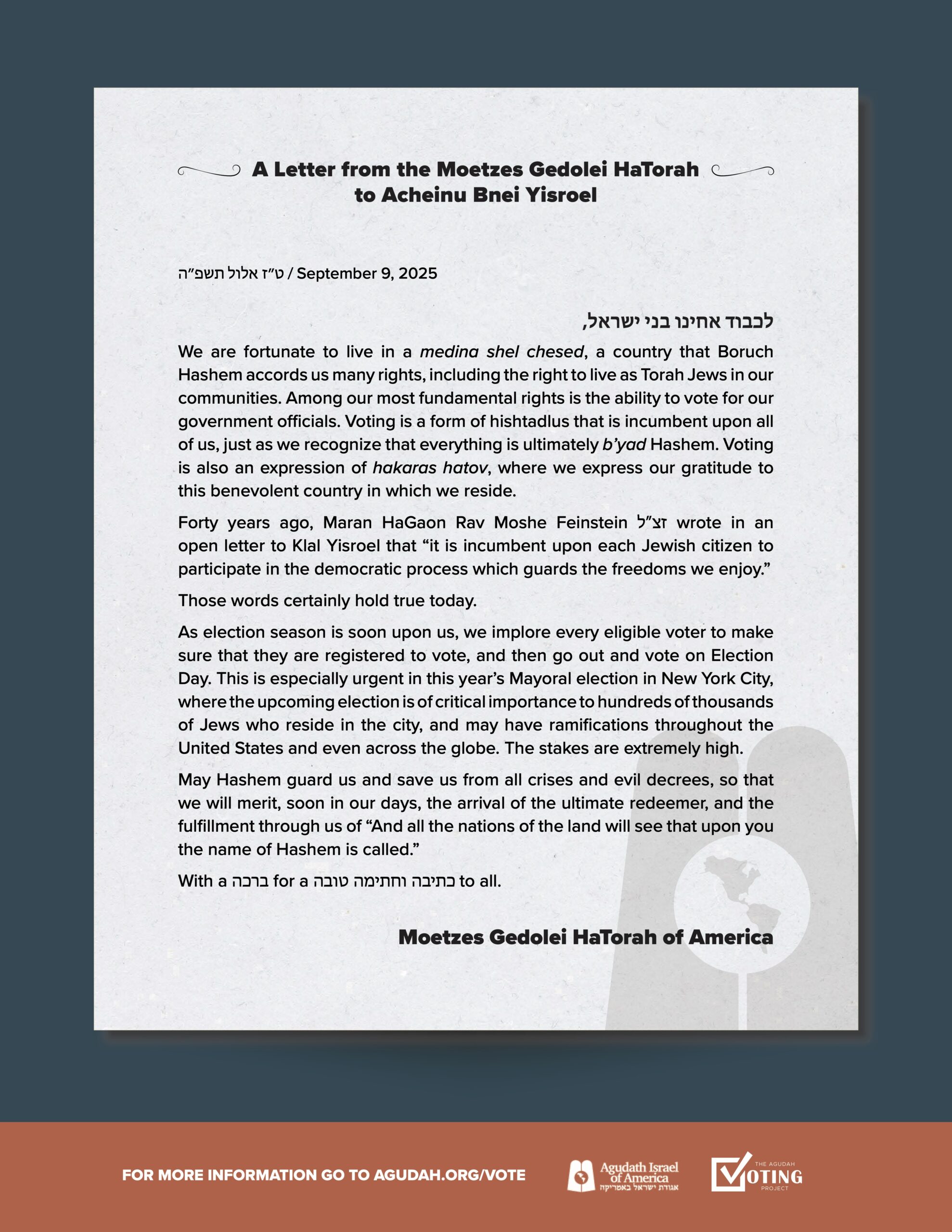 On Wednesday, the Moetzes Gedolei Hatorah of America released a kol koreh urging Jews to register to vote in the upcoming New York City mayoral election.