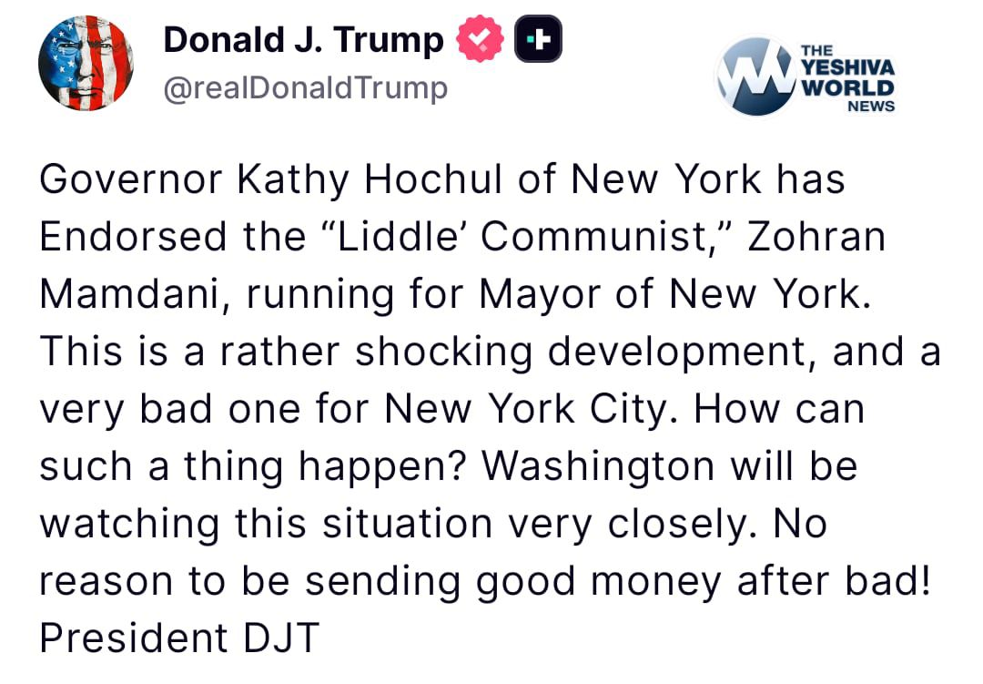 “Governor Kathy Hochul of New York has Endorsed [sic] the ‘Liddle Communist,’ Zohran Mamdani, running for Mayor of New York,” Trump wrote on his social media platform early Monday. “This is a rather shocking development, and a very bad one for New York City. How can such a thing happen? Washington will be watching this situation very closely. No reason to be sending good money after bad!”