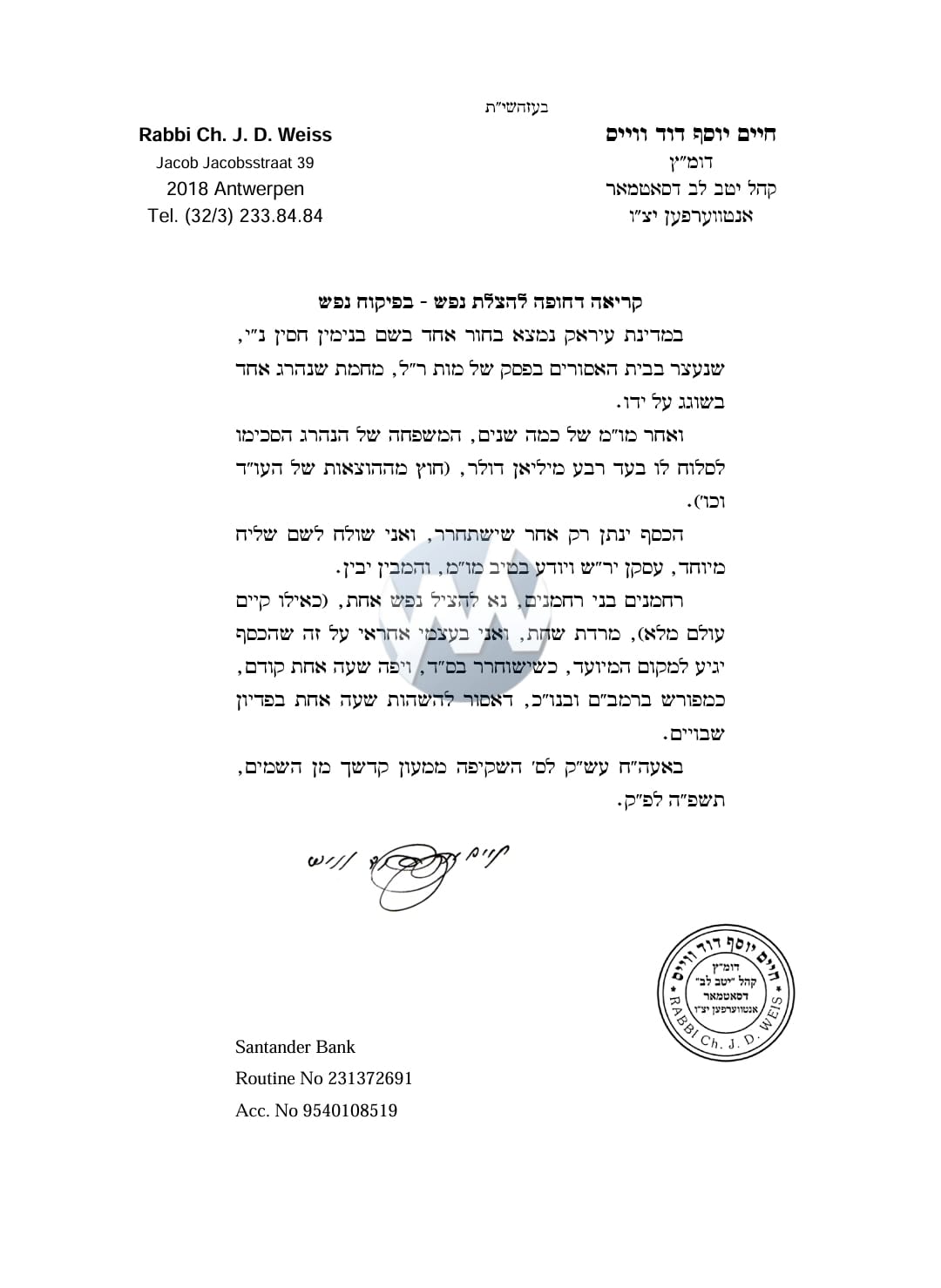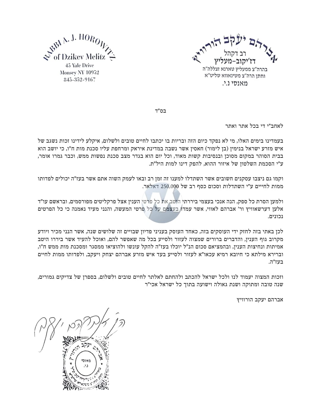 In recent days, letters supporting the effort have been issued by HaRav Chaim Dovid Weiss shlit”a, Satmar Dayan of Antwerp, and the Dzikov-Melitzer Rebbe shlit”a, both of whom for years have been moser nefesh for pidyon shvuyim.