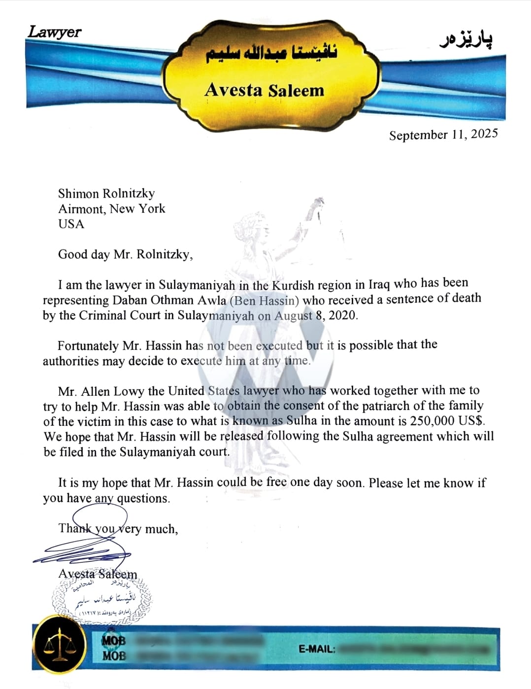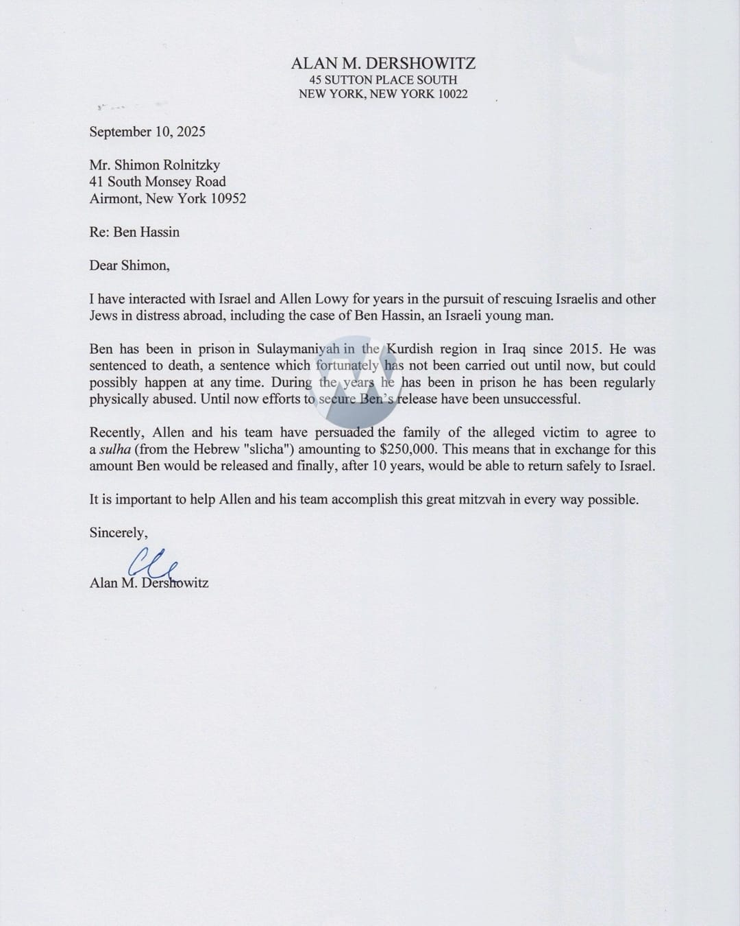 Renowned attorney Alan Dershowitz has been involved in the case, lending his influence and confirming the dire danger in which Binyamin remains. Rabbi Avraham (Alan) Lowy, an askan with years of pidyon shvuyim work, has personally traveled to Iraq multiple times to meet Binyamin, finding him physically broken, trembling, and spitting blood as a result of his sufferings.
