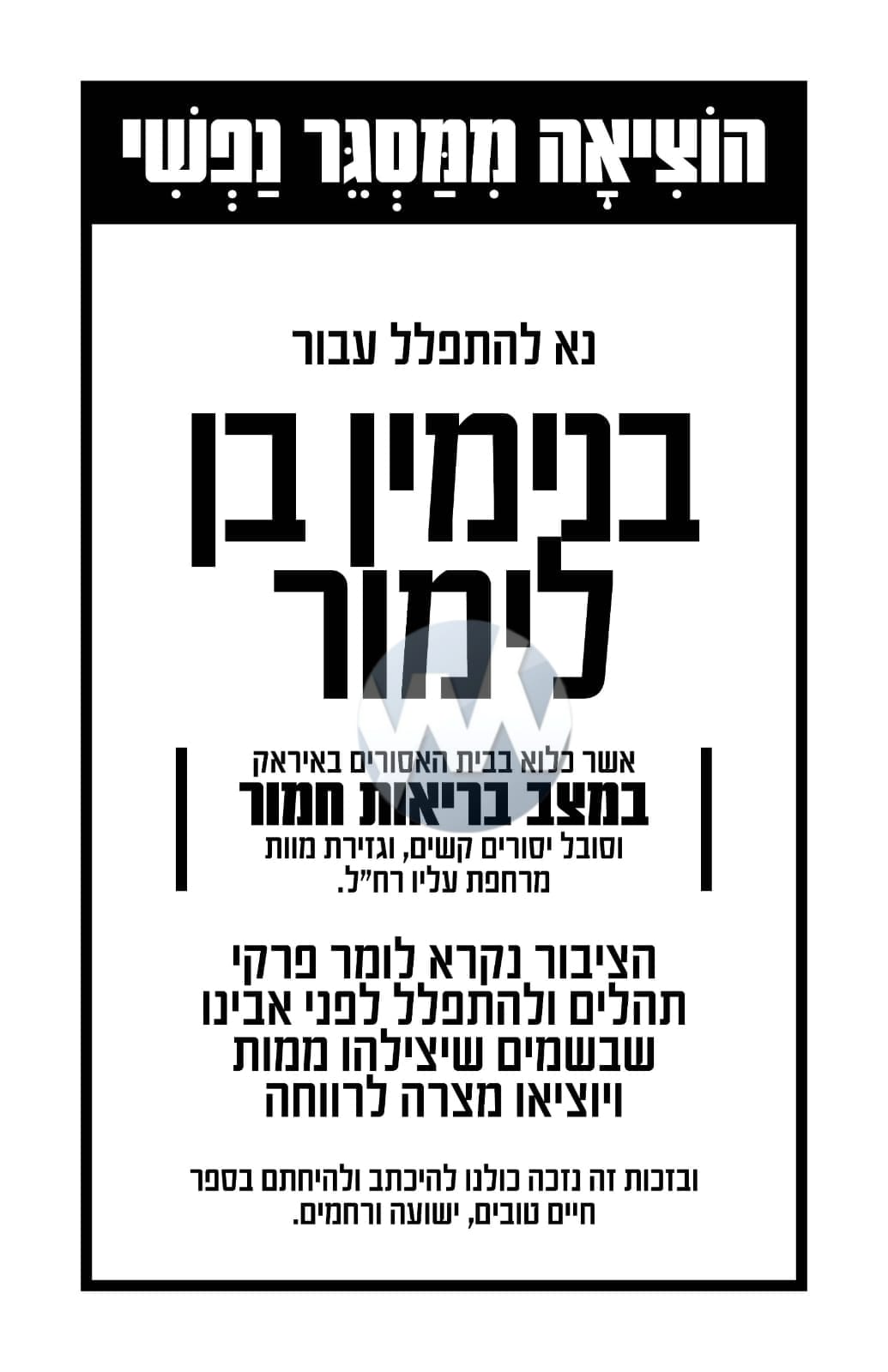 Yidden worldwide are also asked to daven for Binyamin ben Limor, that he should be zocheh to a yeshua me’afeilah l’orah in the very near future.