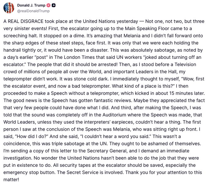 Trump said the first disruption came as he and former First Lady Melania Trump rode an escalator on their way to the main floor of the UN headquarters. The escalator, he claimed, “came to a screeching halt,” nearly causing the couple to fall. He later described the sudden stop as suspicious and suggested foul play.