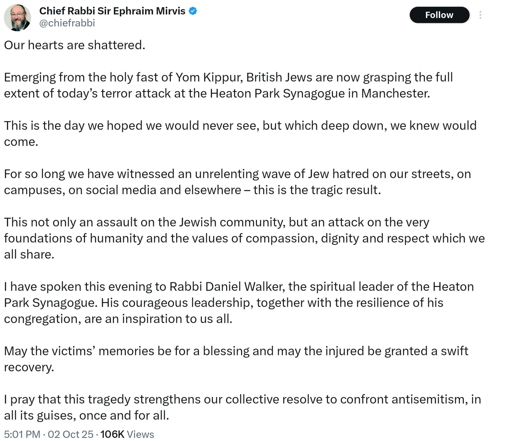 “This is the day we hoped we would never see, but which deep down, we knew would come,” Chief Rabbi Sir Ephraim Mirvis said in a statement. He blamed what he called an “unrelenting wave of Jew hatred” across Britain — on the streets, on campuses, and online — for creating the environment that enabled such an attack.