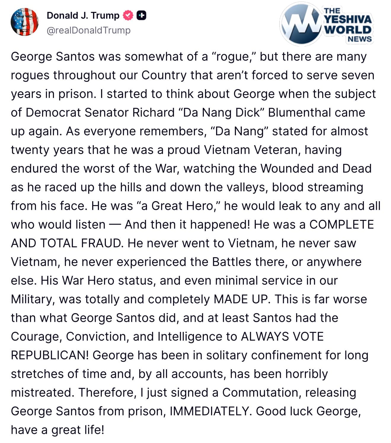 In explaining his reason for granting Santos clemency, Trump said the lies Santos told about himself were no worse than misleading statements U.S. Sen. Richard Blumenthal — a Democrat and frequent critic of the administration — had made about his military record.