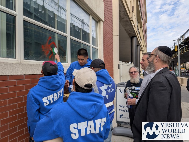 The representatives were briefed by NYPD and Shomrim on the early details of the ongoing investigation by NYPD Hate Crimes and joined the effort to remove every last trace of the hateful symbols from the yeshiva building.