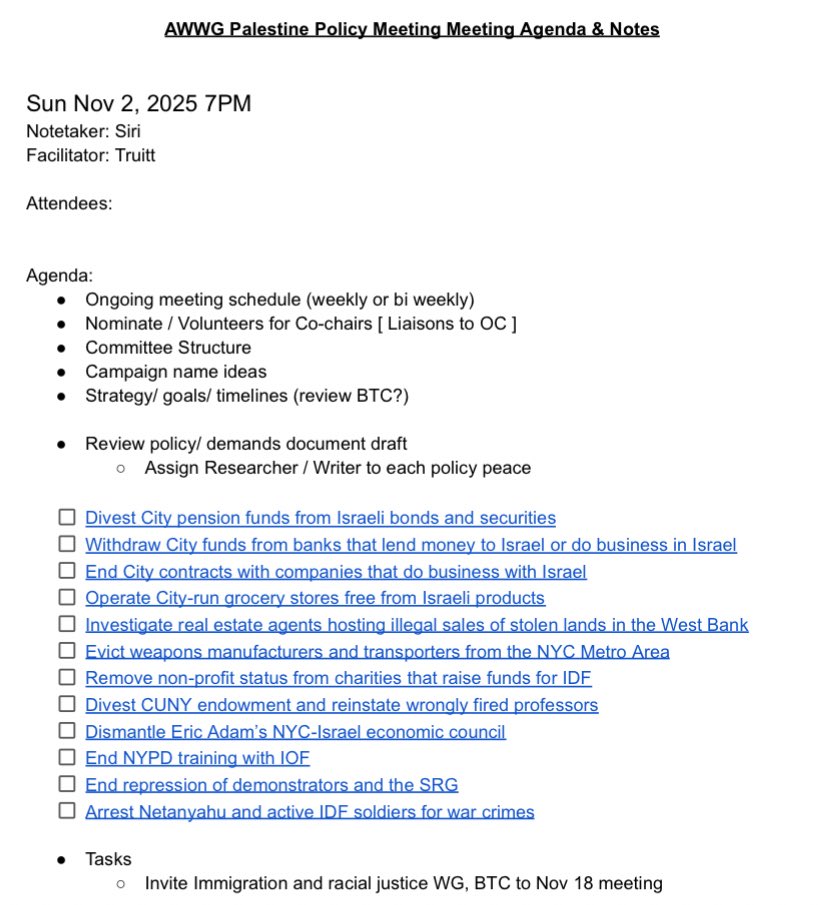 The internal memo, circulated by the DSA’s “Anti-War Working Group,” lays out a list of “demands” that read more like a manifesto than municipal policy. Among them: divesting city pension funds from Israeli bonds, ending all city contracts with companies that do business in Israel, banning Israeli products from city-run grocery stores, and even “arresting Netanyahu and active IDF soldiers for war crimes.” Other items call for the city to “evict weapons manufacturers,” “strip nonprofit status from charities that support the IDF,” and “end NYPD training with the IOF” — a derogatory term for the Israeli Defense Forces.