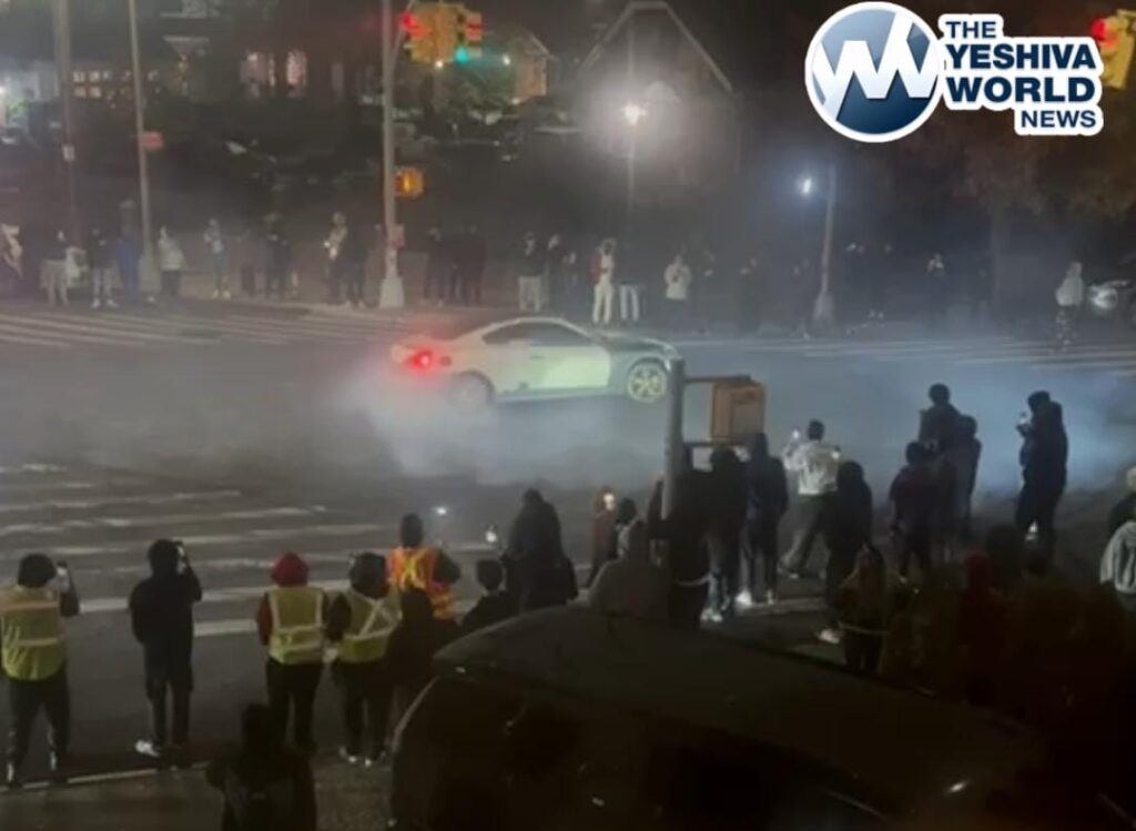 The shocking footage — nearly five minutes long — shows cars blocking intersections, blasting music, and driving recklessly while crowds gathered around. Not a single NYPD officer appeared throughout the five minute video. YWN notes that an NYPD response to any part of the 66 or 70 precinct at 3:00AM should take less than 3 minutes, as there is no traffic whatsoever.