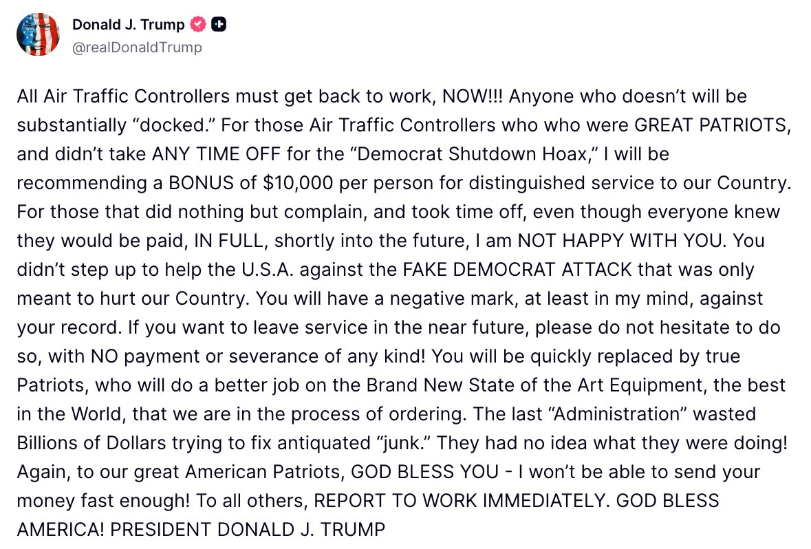 “All Air Traffic Controllers must get back to work, NOW!!! Anyone who doesn’t will be substantially ‘docked,’” Trump wrote in a post on his Truth Social platform.