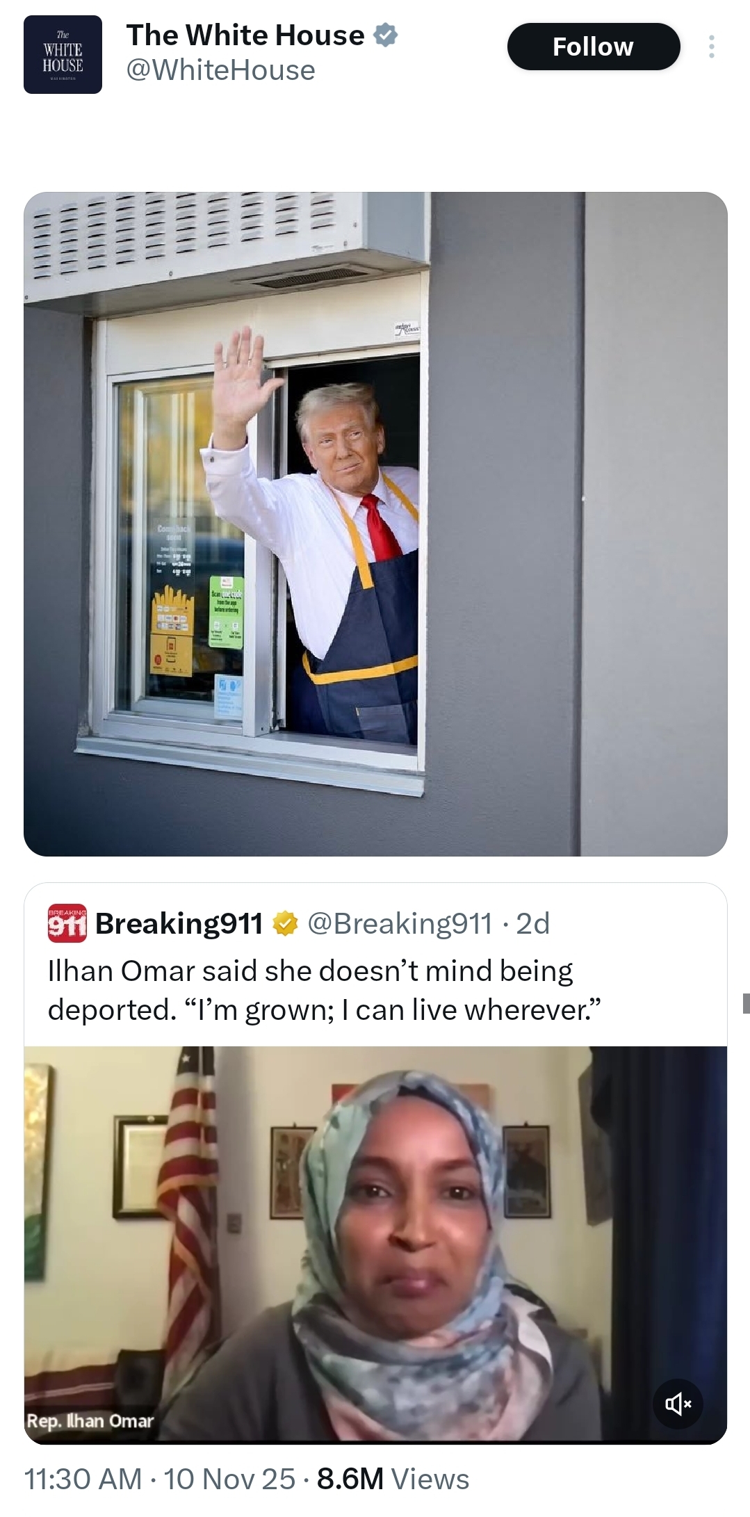 Hours later, the White House’s account replied to the video with a 2024 photo of Trump grinning and waving through a McDonald’s window in Pennsylvania — the captionless image a mocking “bon voyage” to Omar. The photo, taken during a 2024 campaign stop when Trump briefly worked the fry station, immediately went viral, sparking outrage from Democrats and glee from many of Trump’s supporters.