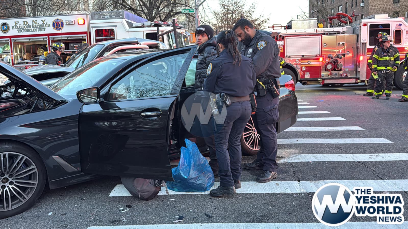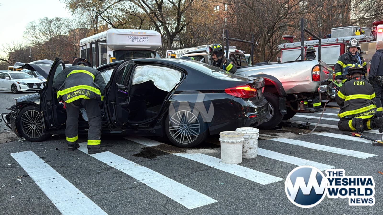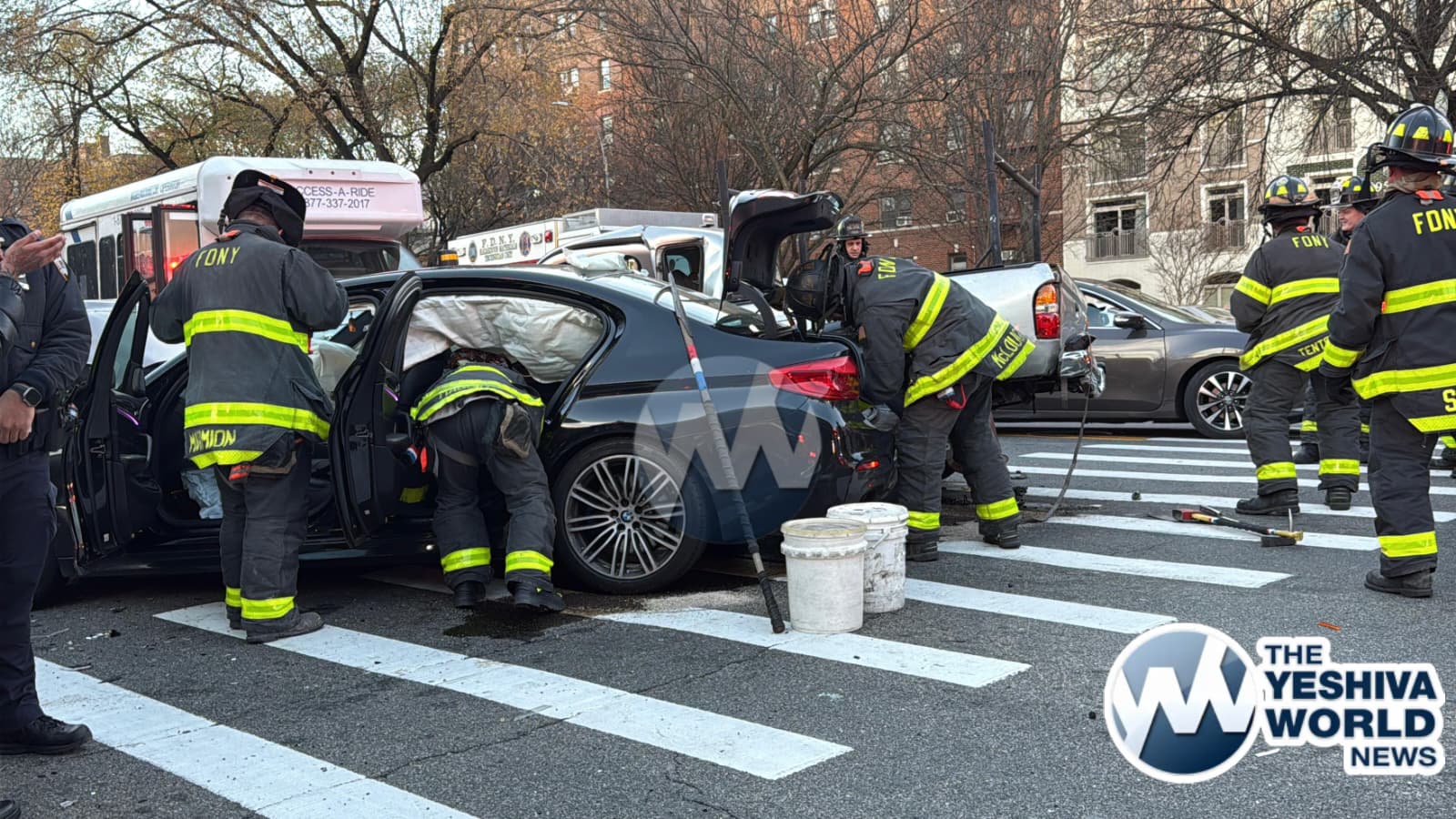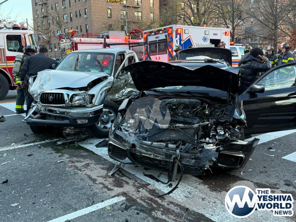 At approximately 3:50 PM on Monday afternoon, Flatbush Hatzolah and other emergency personnel responded to a serious MVA at Ocean Parkway and Avenue L. Three vehicles were involved, including a BMW, another car, and an Access-A-Ride bus. FDNY firefighters were forced to drain the gas tank of one of the vehicles to prevent a potential fire hazard.