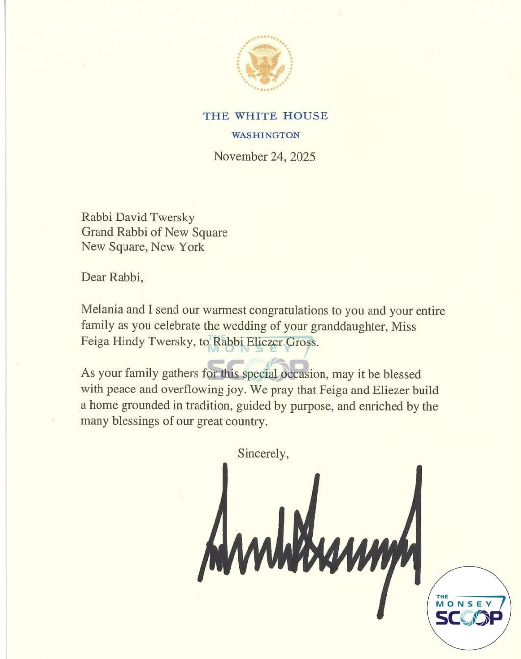 President Donald J. Trump, sent a heartfelt Mazel Tov letter to the Skvere Rebbe Shlita, in honor of the wedding of his granddaughter, which took place Monday evening in New Square. The letter, written on official White House stationery, conveyed warm wishes from the President and First Lady Melania Trump and offered blessings of joy, peace, and a home “grounded in tradition and guided by purpose.”
