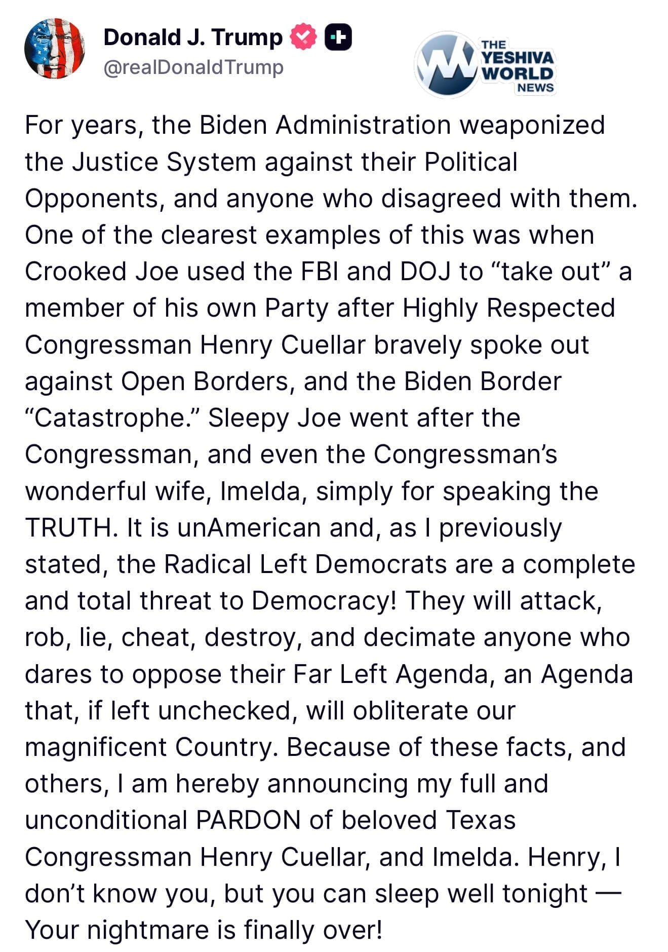 President Donald Trump pardoned Texas Democratic Rep. Henry Cuellar and his wife in a federal bribery and conspiracy case on Wednesday, citing what he called a “weaponized” justice system.