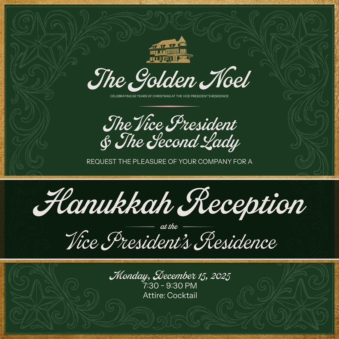 The green-and-gold invite, set for a December 15 cocktail reception, was billed as a “Hanukkah Reception at the Vice President’s Residence” and sent in the names of Vance and Second Lady Usha Vance. But across the top, in bold lettering, the invitation read: “The Golden Noel: Celebrating 50 Years of Christmas at the Vice President’s Residence.”