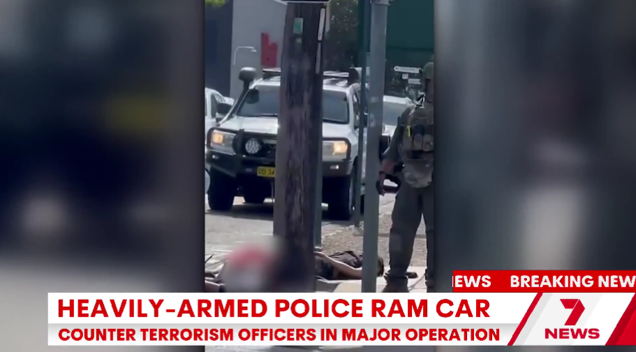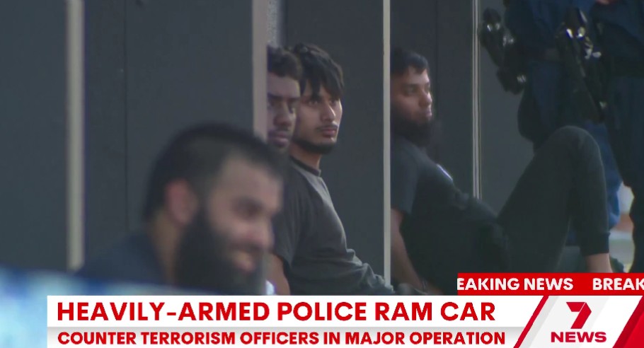 7NEWS Sydney described the scene: “A white hatchback was rammed by a vehicle with heavily armed officers. They pulled five men out of a car and quickly got them on the ground with their hands tied behind their backs. Two people were then pulled out of another car and arrested.”