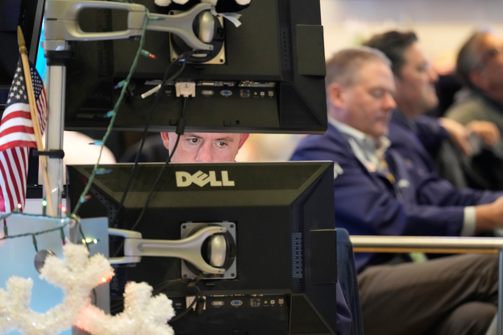 Justin Flinn, left, works on the floor at the New York Stock Exchange in New York, Wednesday, Dec. 10, 2025. (AP Photo/Seth Wenig)