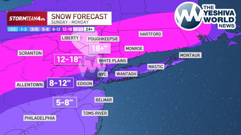 The Hudson Valley, Connecticut, and northern parts of New Jersey are forecast to receive between 12 to 18 inches of snow, while Central New Jersey and Long Island are expected to see similar totals to New York City.