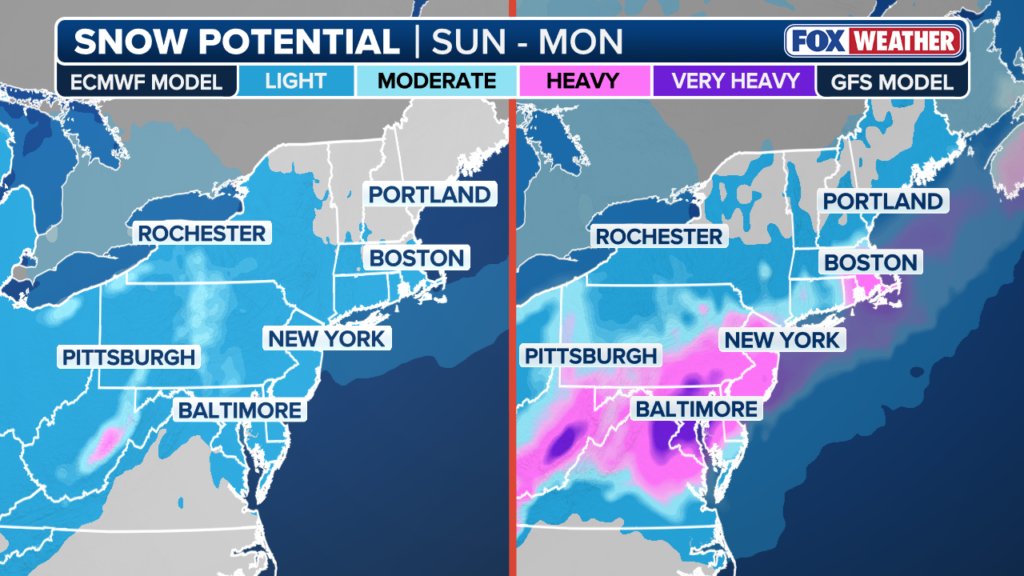 Several AI models are signaling the possibility of a significant snow event from Sunday night into Monday. For major impacts to materialize, experts say multiple factors would need to align, including a slow-moving storm track close to the coast and sufficient cold air from Canada.