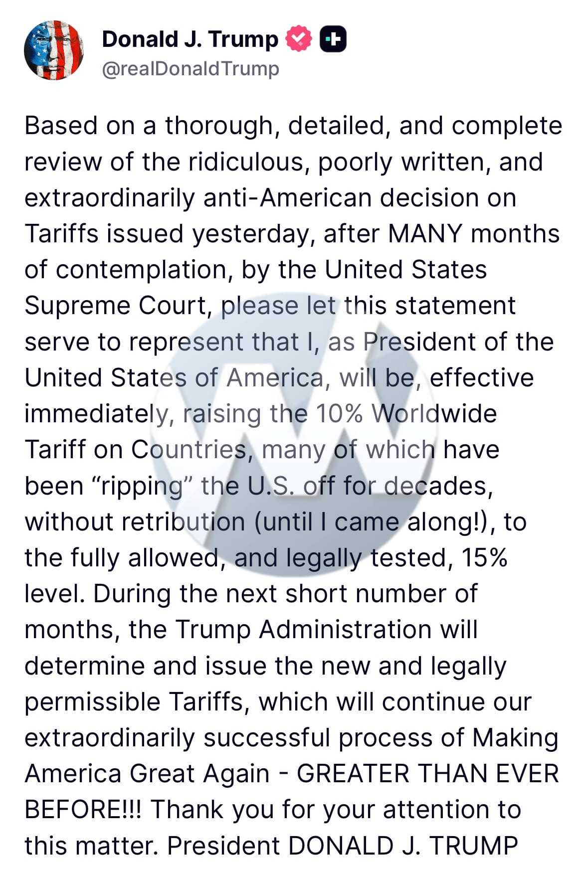 “I, as President of the United States of America, will be, effective immediately, raising the 10% Worldwide Tariff on Countries, many of which have been ‘ripping’ the US off for decades, without retribution (until I came along!), to the fully allowed, and legally tested, 15% level,” Trump wrote in a social media post.