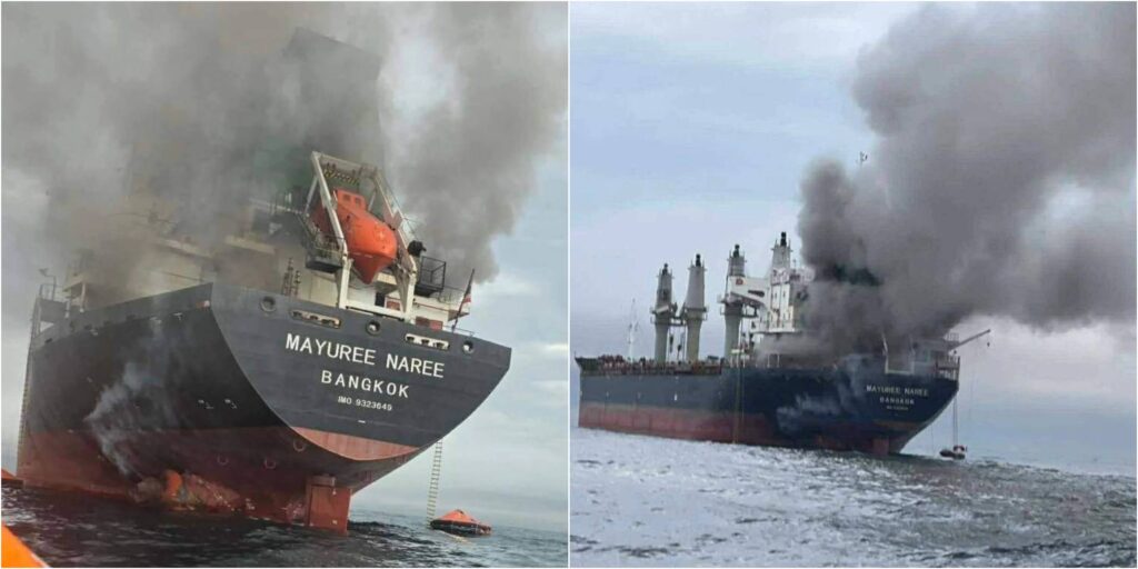 Images released by the Royal Thai Navy shows Thai cargo ship, Mayuree Naree, that was struck and set ablaze in the Strait of Hormuz Wednesday, March 11, 2026. (Royal Thai Navy via AP)